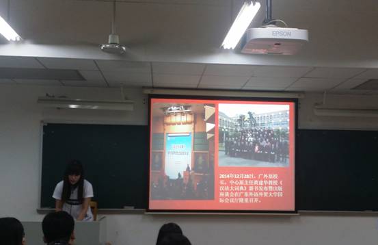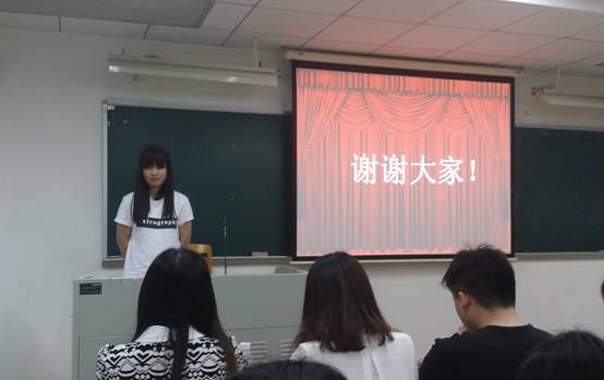 各个支部各显身手,精美的PPT,展示人的个人魅力都让观众深深折服。词典学研究中心支部在第八个展示。王燕同学作为展示代表,介绍了词典学研究中心团支部的组织情况,制度简介,从思想建设,学风建设,主题团日活动和中心其他文体活动这几个方面,全面展示了我们词典中心团支部开展的一系列的活动。其中突出的有主题为感悟历史的凝重,追寻历史的变迁的广东历史博物馆之旅,还有书山有路勤为径,学海无涯苦作舟的广州图书馆的活动,再有展现青春活力的白云山之行。王燕还介绍了中心参加了学习十八届四中全会的会议,举办学术沙龙,承办了黄建华教授的《汉法大辞典》的新书发布会。学习方面还有参加了商务印书馆总编辑周洪波博士的“语言生活与辞书创新”讲座等等活动,体现出我们团支部响应党和学校的号召,提升党员团员的素质,深化理论与实践相结合。经过王燕同学五分钟的精彩展示,各位评委提出问题。王燕同学结合专业特点和党团的知识,认为编纂词典是对社会的贡献,是实现自身价值的重要体现。王燕同学的精彩回答受到了评委的认同。